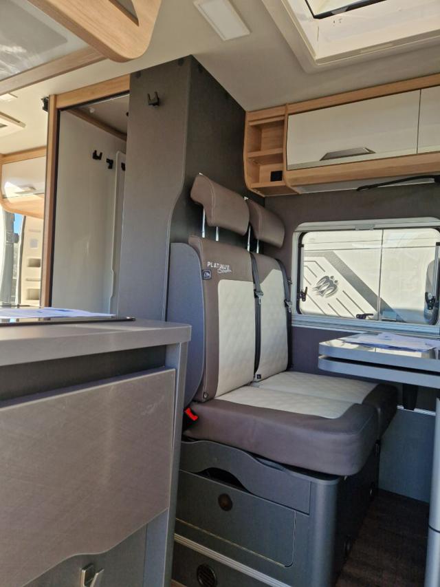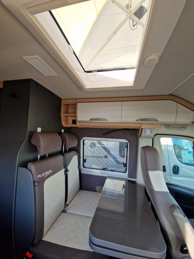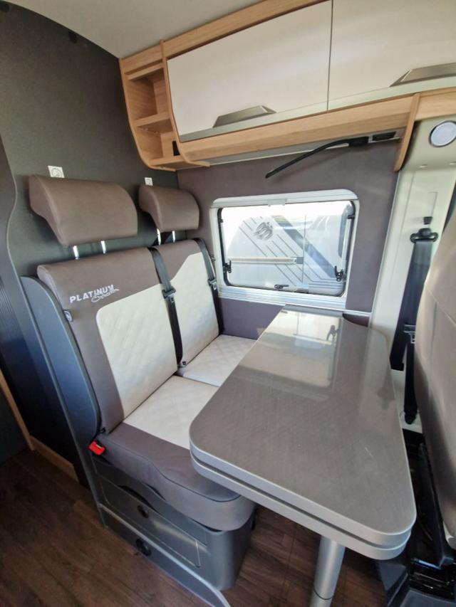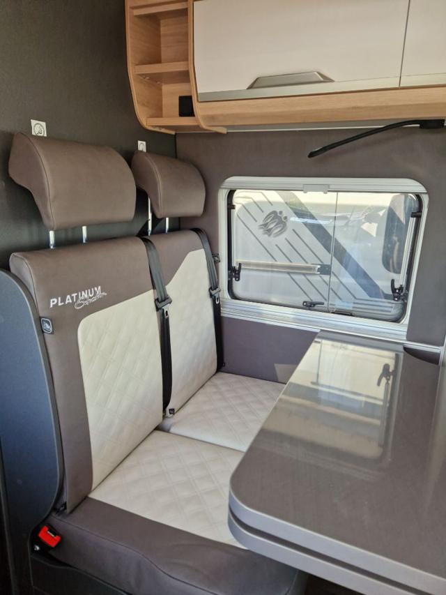 Lamelle dello spoiler (skid-plate) • Pneumatici da 16" • Serigrafia speciale “PLATINUM SELECTION” • Logo KNAUS per parte anteriore e posteriore, nero/cromo • Tappezzeria: Variante alternativa in pelle vegana "NATURAL STONE" "PLATINUM SELECTION